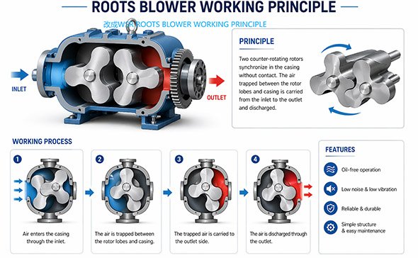 As the rotors rotate, the volume on the inlet side increases, drawing air into the casing and filling the chamber. With continued rotation, the air is trapped in the space between the rotor and the casing and carried to the discharge side. At the discharge port, where the pressure is higher, the air is pushed out, completing one cycle of continuous gas delivery.